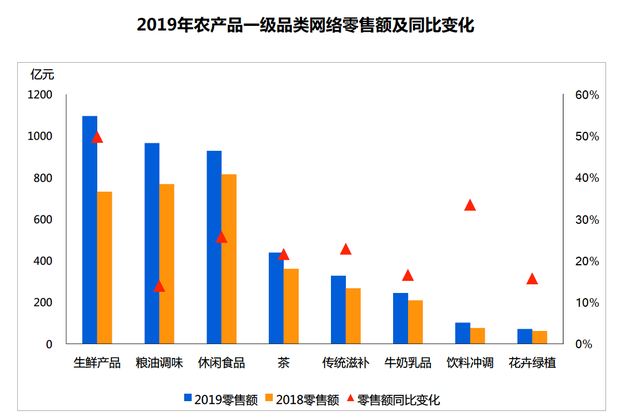 近日,在農業農村部市場與信息化司的指導與支持下,中國農業科學院農業信息研究所發布《中國農產品網絡零售市場暨重點單品分析報告》(以下簡稱《報告》)。報告針對全國農產品網絡零售市場進行分析,其中2019年生鮮產品網絡零售額突破1094.9億元,成為農產品上行第一大品類,網絡零售量同比增加78.4%。