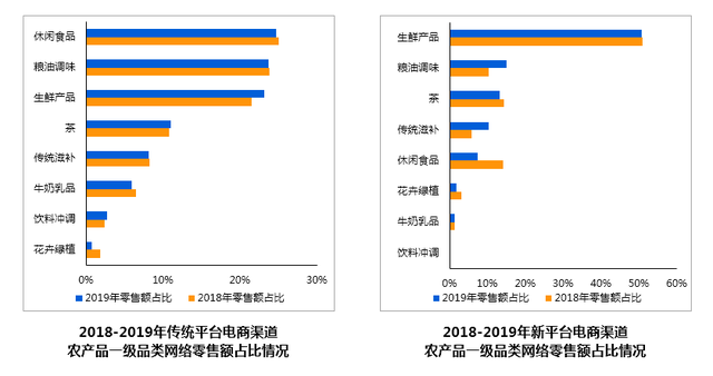 《報告》分析,傳統電商平臺中,農產品網絡銷售前三大品類依次為休閑食品、糧油調味、生鮮產品,占比分別為25%、23.8%、21.5%。但以拼多多為代表的新電商平臺以及新零售渠道中,生鮮產品的網絡零售額占比均超過50%,而傳統電商平臺生鮮產品零售額占比不足25%。