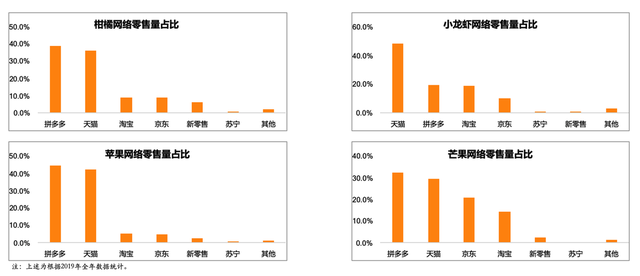 同時,在蘋果、柑橘、芒果品類的網絡零售量分布中,來自拼多多等新電商平臺的渠道占比分別達44.35%、38.6%、32.2%,均排名第一。在“網紅單品”小龍蝦品類中,傳統電商平臺仍占絕對優勢,但新電商平臺消費增長迅速,渠道占比已躍居第二。