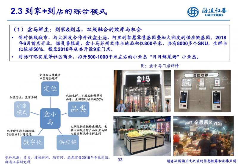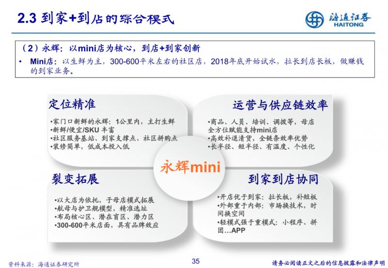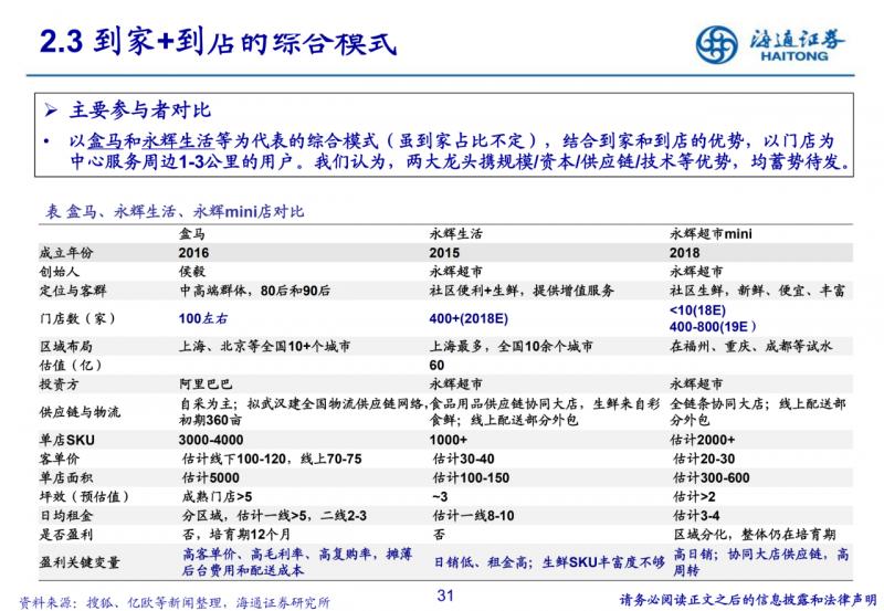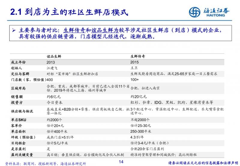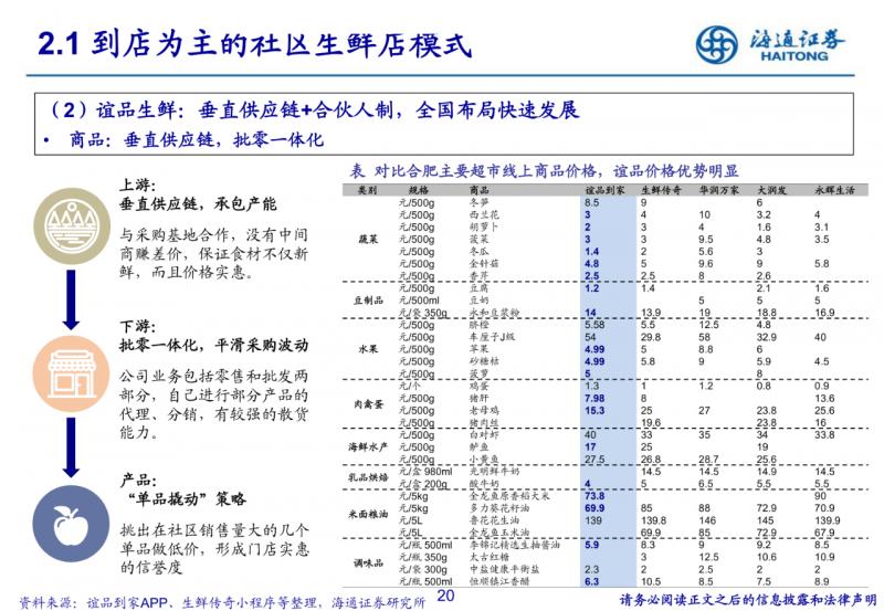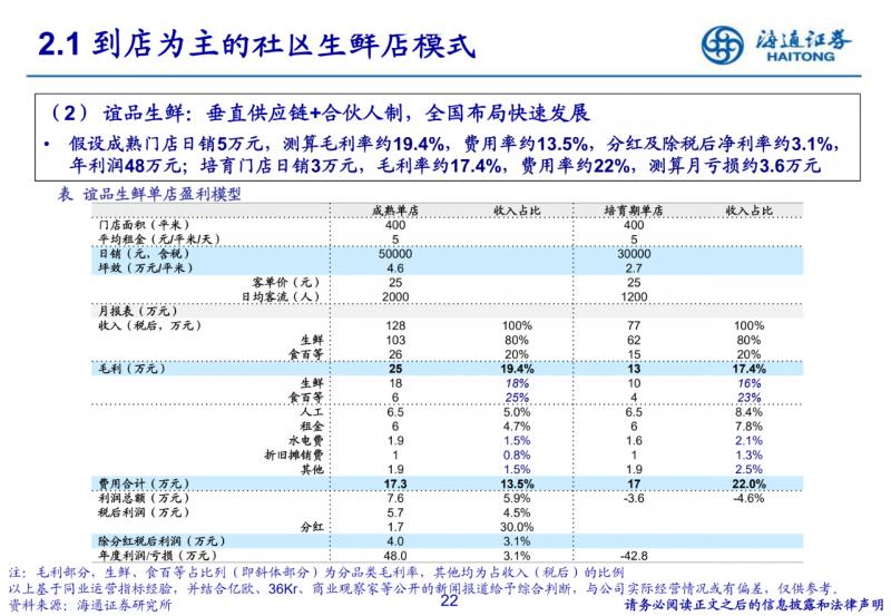 到店為主的社區生鮮店模式。400-500平米社區店,主打生鮮,便捷、低價、優質;但依賴供應鏈與品牌效應, 跨區域難度較大。