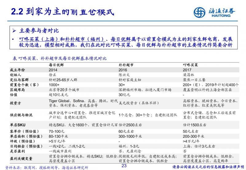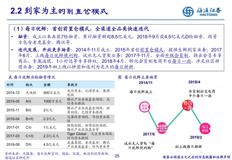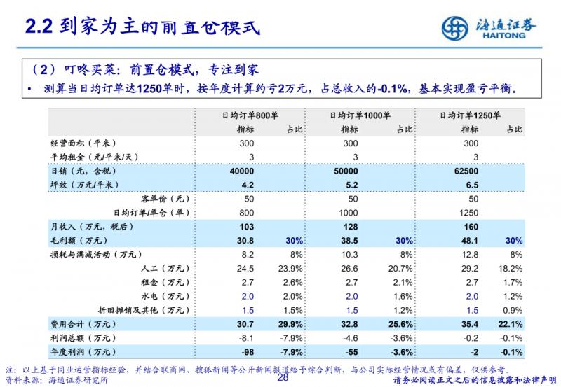 純到家的前置倉電商模式。將前置倉建在社區周邊,配送效率及物業可獲取性高,注重到家體驗、商品品質與 復購率,初期拉新若過度促銷會嚴重損耗毛利率。