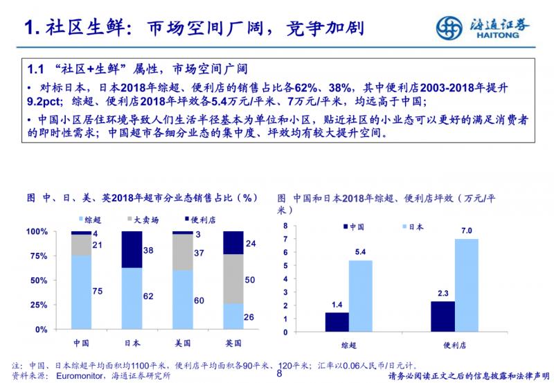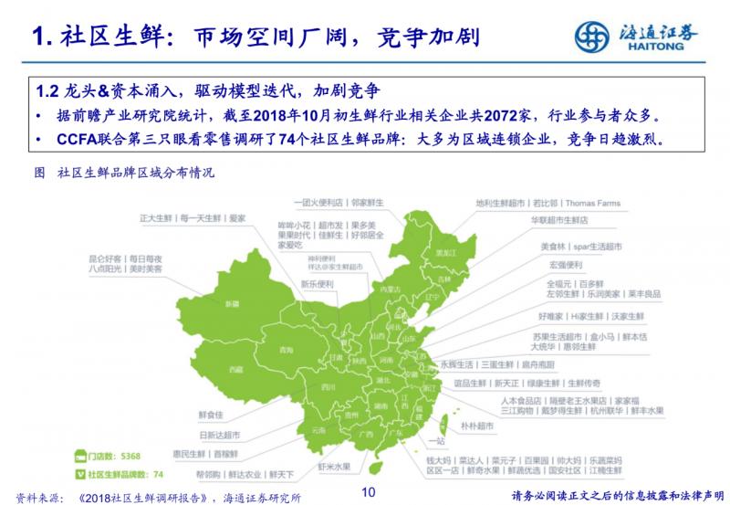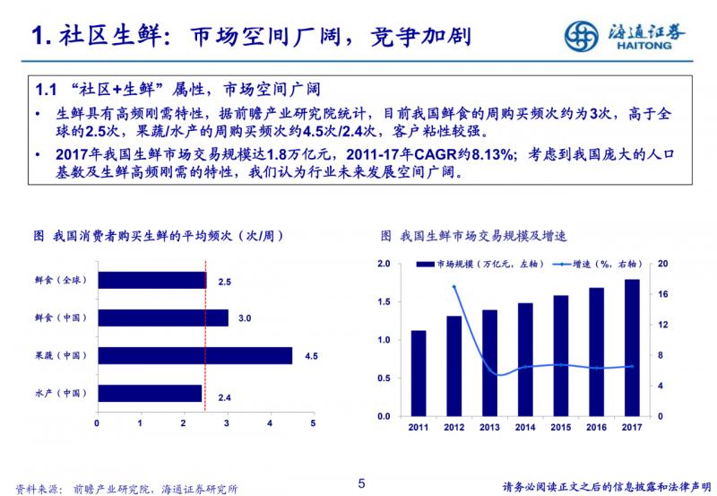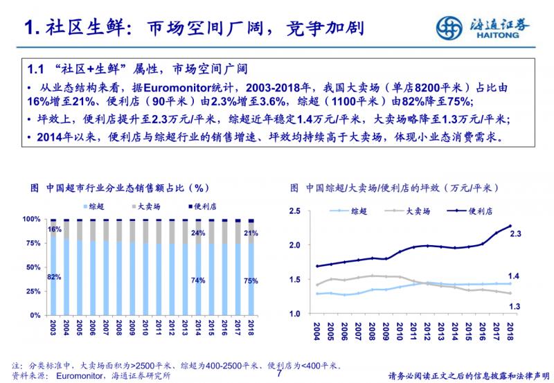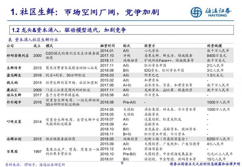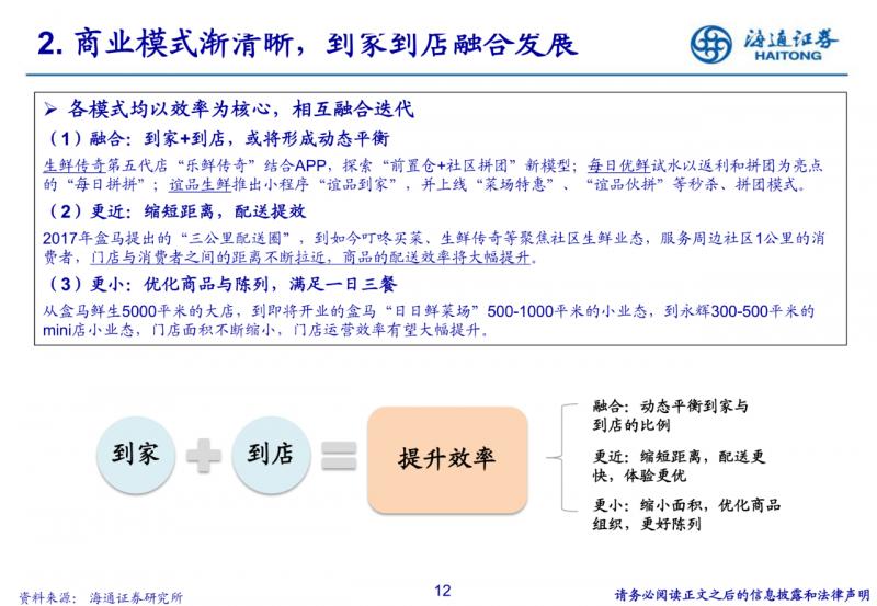 社區生鮮:市場空間廣闊,競爭加劇。隨著零售龍頭及資本方入局,新模式不斷興起,逐漸形成社區生鮮店、前置倉電商、到家到店結合、社區拼團等商業模式,均以效 率為核心(更近更快、更有效的商品組合、更優化的面積與陳列),且各模式之間取長補短、相互融合發展。