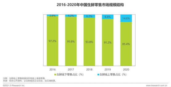 從渠道來看,超市、菜市場等線下零售渠道仍是生鮮購買的主要渠道。雖然生鮮線上滲透率較低,但增速迅猛,新冠疫情的出現更是加快了網購生鮮的普及,2020年中國生鮮線上零售占比達14.6%,隨著消費者網購生鮮習慣的逐漸養成以及生鮮零售市場對線上生鮮零售愈發重視,生鮮線上滲透率還將逐步提升。