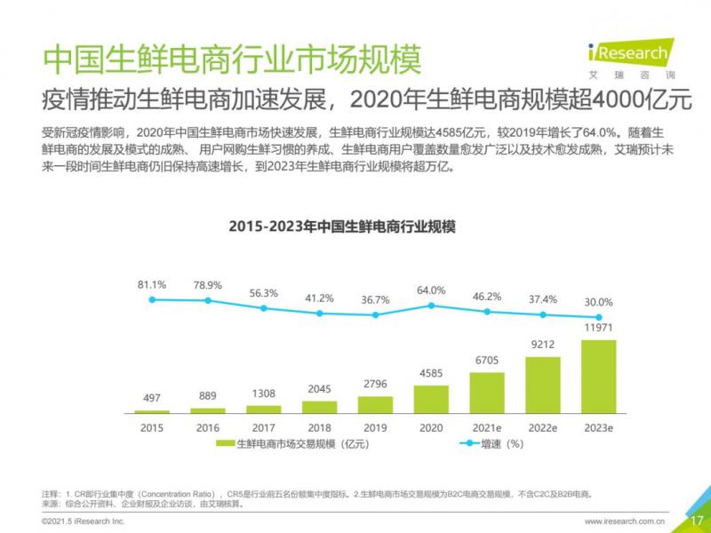 隨著生鮮電商的發展及模式的成熟、用戶網購生鮮習慣的養成、生鮮電商用戶覆蓋數量愈發廣泛,以及技術愈發成熟,艾瑞預計生鮮電商仍會保持高速增長,到2023年行業規模將超萬億。