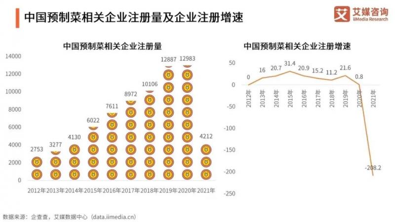 近年來,中國預制菜相關企業(yè)注冊量飆升,尤其是2020年,中國預制菜相關企業(yè)注冊量達到12983家,成為近兩年的峰值,而2021年中國預制菜相關企業(yè)注冊量只有4212家。增速出現(xiàn)了明顯下滑的態(tài)勢,成為近十年首次注冊增速負增長。