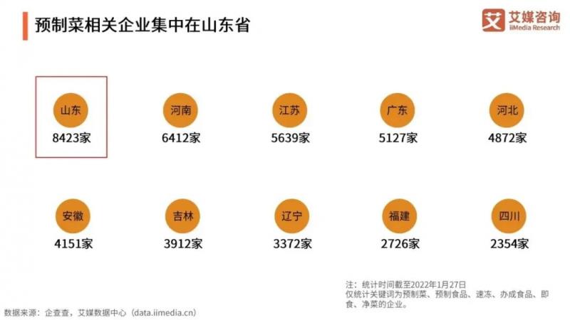 預制菜相關企業(yè)集中在山東省。數(shù)據(jù)顯示,山東現(xiàn)有預制菜相關企業(yè)8423家,其次是河南省,共有6412家,再者是江蘇5639家。其余則是廣東、河北、安徽、吉林、遼寧、福建和四川。