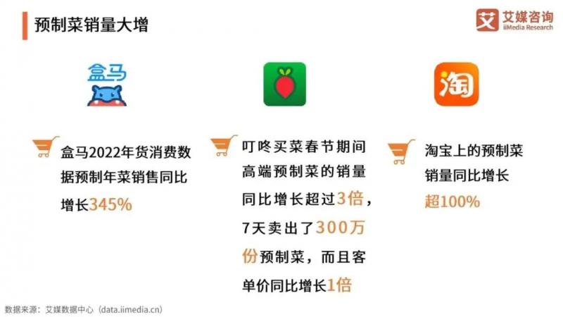 2022年以來,預制菜銷量大增,盒馬2022年貨消費數(shù)據(jù)預制年菜銷售同比增長345%;叮咚買菜春節(jié)期間高端預制菜的銷量同比增長超過3倍,7天賣出了300萬份預制菜,而且客單價同比增長1倍;淘寶上的預制菜銷量同比增長超100%。