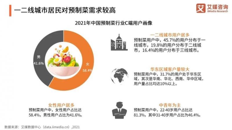從目前的數(shù)據(jù)來看,一二線城市對預制菜需求較高,女性用戶居多,占比為58.4%,男性用戶占比為41.6%;一二線城市用戶居多;華東區(qū)域客戶量較大;主要以中青年為主。