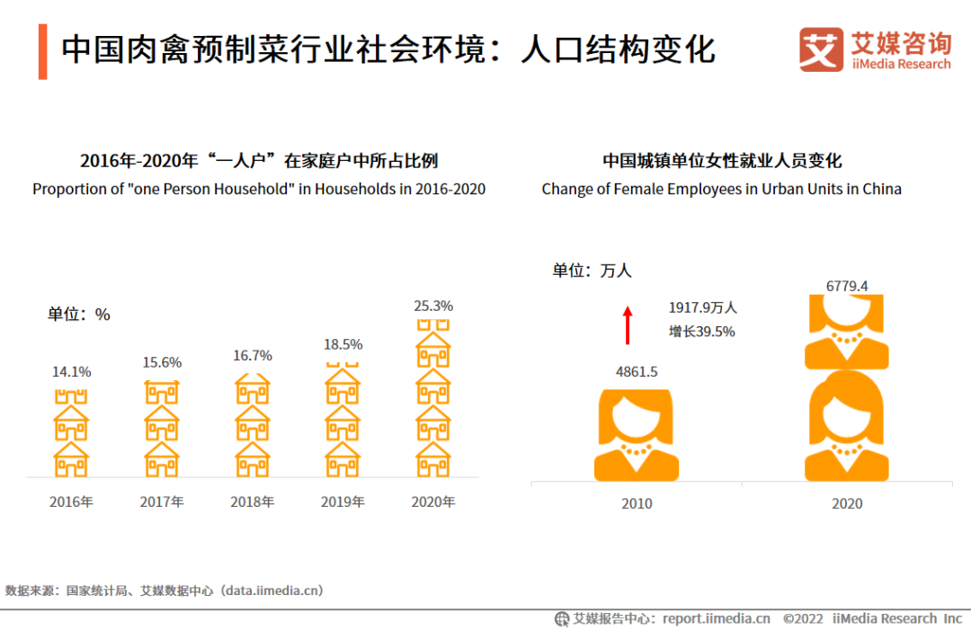 數據顯示,2016-2020年,一人居住的家庭戶占比也逐年升高,2020年“一人戶”人口達1.25億人,占總家庭戶的25.3%。城鎮單位女性就業人員2020年達6779.4萬人,較2010年增長39.5%。艾媒咨詢分析師認為,中國居民婚姻結構、勞動結構發生變化, “一人戶”家庭數占比呈現增長態勢。越來越多女性從全職家庭主婦轉變成職場女性,而且工作繁忙,預制菜的出現,能有效地縮短做飯時長,且可以保證做飯的質量,從而帶動預制菜市場的發展。