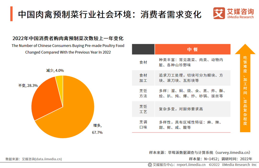 數據顯示,2022年,67.7%的中國預制菜消費者購買肉禽預制菜次數增多,28.3%的消費者不變,僅有4.0%的消費者消費次數減少。艾媒咨詢分析師認為,中國菜品種類繁多、加工流程繁瑣、加工耗時,隨著工作節奏加快、家庭小型化發展,消費者愿意花在做飯上的時間變短,預制菜消費需求逐漸上升。