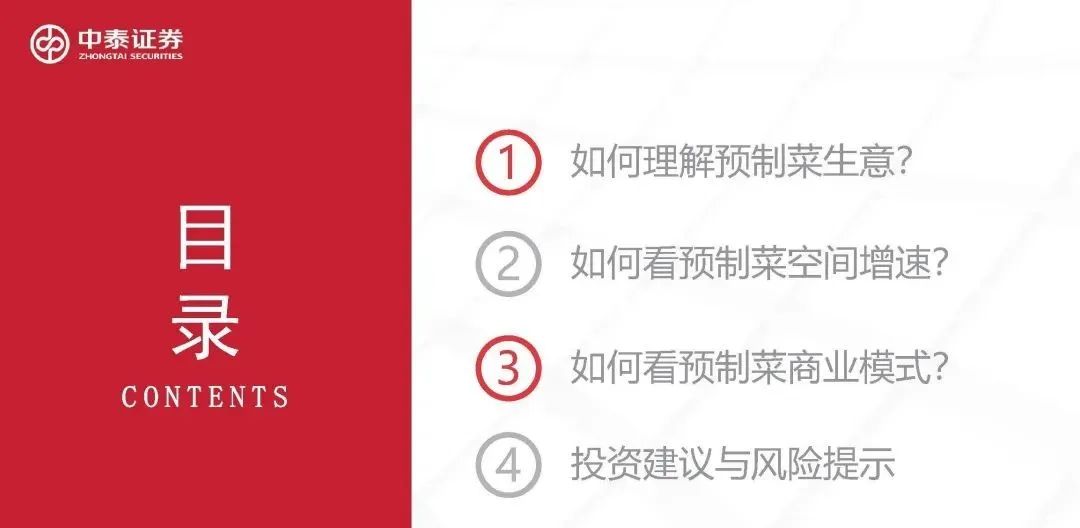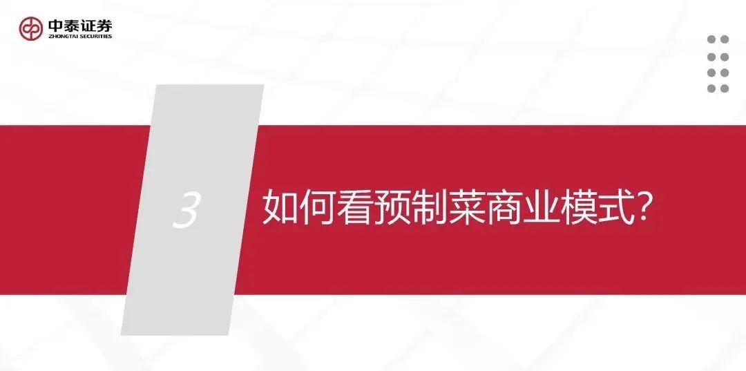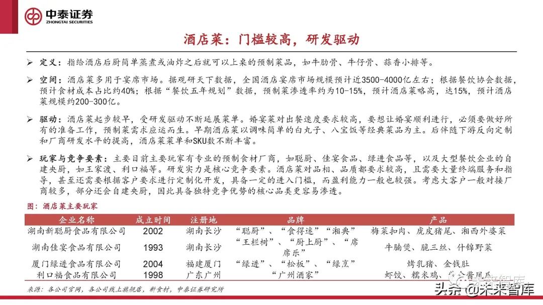 酒店菜:以半成品菜為主,酒店廚師在此基礎(chǔ)上再加工,主打宴席市場(chǎng),對(duì)品相、口味均具有較高要求,進(jìn)入壁壘 和附加值都較高,研發(fā)實(shí)力和客戶服務(wù)是關(guān)鍵。