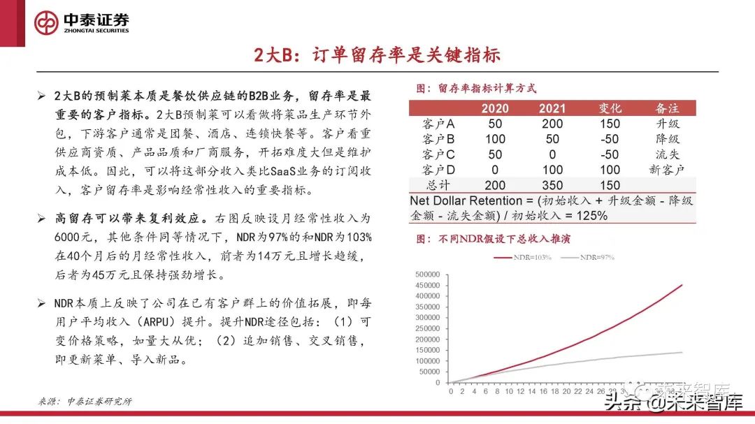 2大B的預(yù)制菜本質(zhì)是餐飲供應(yīng)鏈的B2B業(yè)務(wù),留存率是最 重要的客戶指標(biāo)。2大B預(yù)制菜可以看做將菜品生產(chǎn)環(huán)節(jié)外 包,下游客戶通常是團(tuán)餐、酒店、連鎖快餐等??蛻艨粗?供應(yīng)商資質(zhì)、產(chǎn)品品質(zhì)和廠商服務(wù),開(kāi)拓難度大但是維護(hù) 成本低。因此,可以將這部分收入類比SaaS業(yè)務(wù)的訂閱收 入,客戶留存率是影響經(jīng)常性收入的重要指標(biāo)。