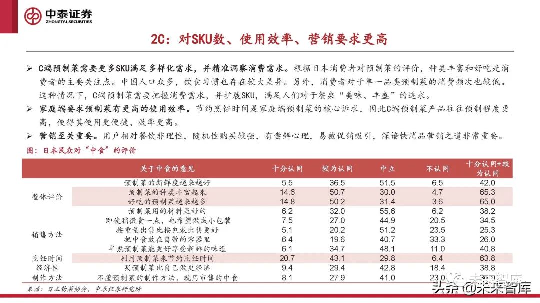 C端預(yù)制菜需要更多SKU滿足多樣化需求,并精準(zhǔn)洞察消費(fèi)需求。根據(jù)日本消費(fèi)者對(duì)預(yù)制菜的評(píng)價(jià),種類豐富和好吃是消 費(fèi)者的主要關(guān)注點(diǎn)。中國(guó)人口眾多,飲食習(xí)慣也存在較大差異。另外,消費(fèi)者對(duì)于單一品類預(yù)制菜的消費(fèi)頻次也較低。這種情況下,C端預(yù)制菜需要把握消費(fèi)需求,并擴(kuò)展SKU,滿足人們對(duì)于餐桌“美味、豐盛”的追求。