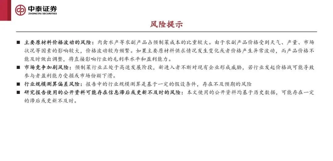 綜合體驗(yàn):產(chǎn)品易用性、口味還原度等,預(yù)制菜 企業(yè)需要持續(xù)研發(fā)迭代,輔以終端指導(dǎo)和服務(wù)以 滿足客戶需求,能有效融合技術(shù)、服務(wù)等多種優(yōu) 勢(shì)的產(chǎn)品,才具備更高壁壘。