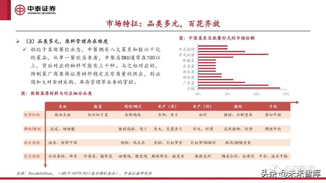 相比于其他餐飲業(yè)態(tài),中餐擁有八大菜系和數(shù)以千記 的菜品,從單一餐飲店來(lái)看,中餐店SKU通常在100以 上,背后對(duì)應(yīng)的物料可能有上千種。與之相對(duì)應(yīng)的, 預(yù)制菜廠商要保證原材料穩(wěn)定且有質(zhì)量的供應(yīng),則必 須加大對(duì)食材采購(gòu)、庫(kù)存管理等業(yè)務(wù)的掌控。