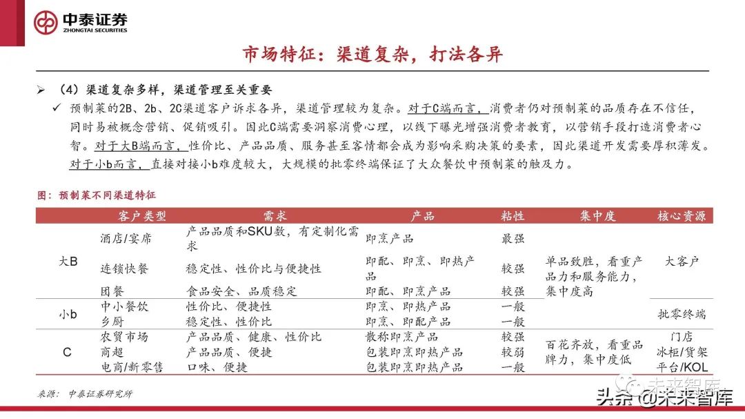 預(yù)制菜的2B、2b、2C渠道客戶訴求各異,渠道管理較為復(fù)雜。對(duì)于C端而言,消費(fèi)者仍對(duì)預(yù)制菜的品質(zhì)存在不信任, 同時(shí)易被概念營(yíng)銷、促銷吸引。因此C端需要洞察消費(fèi)心理,以線下曝光增強(qiáng)消費(fèi)者教育,以營(yíng)銷手段打造消費(fèi)者心 智。對(duì)于大B端而言,性價(jià)比、產(chǎn)品品質(zhì)、服務(wù)甚至客情都會(huì)成為影響采購(gòu)決策的要素,因此渠道開(kāi)發(fā)需要厚積薄發(fā)。對(duì)于小b而言,直接對(duì)接小b難度較大,大規(guī)模的批零終端保證了大眾餐飲中預(yù)制菜的觸及力。