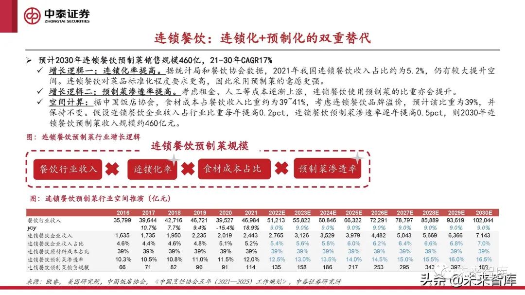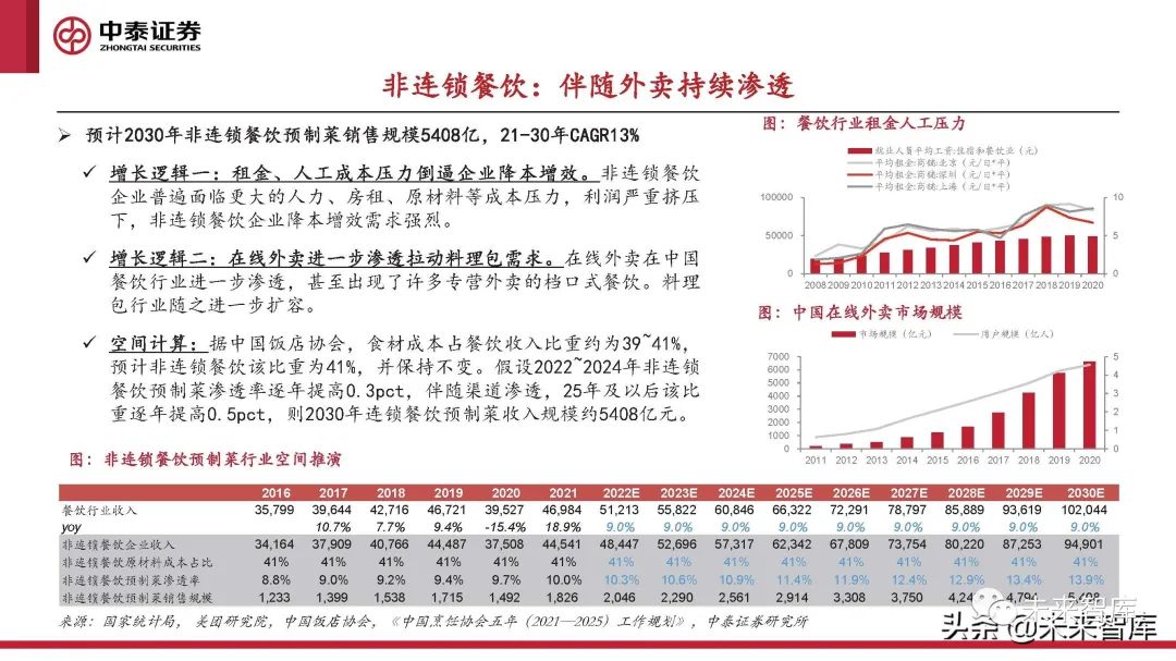 空間計(jì)算:據(jù)中國(guó)飯店協(xié)會(huì),食材成本占餐飲收入比重約為39~41%, 預(yù)計(jì)非連鎖餐飲該比重為41%,并保持不變。假設(shè)2022~2024年非連鎖 餐飲預(yù)制菜滲透率逐年提高0.3pct,伴隨渠道滲透,25年及以后該比 重逐年提高0.5pct,則2030年連鎖餐飲預(yù)制菜收入規(guī)模約5408億元。(報(bào)告來(lái)源:未來(lái)智庫(kù))
