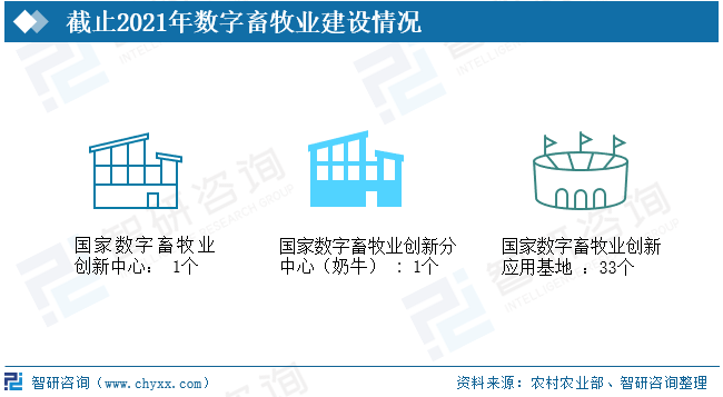 在政策的支持下,截至2021年底,已建設1個國家數字畜牧業創新中心、1個國家數字畜牧業創新分中心(奶牛)、33個國家數字畜牧業創新應用基地(其中支持內蒙古自治區1個),創新中心與應用基地的建設可為智慧養殖的發展開展前沿性技術的研發,開展相關技術產品集成應用、熟化、示范推廣等。
