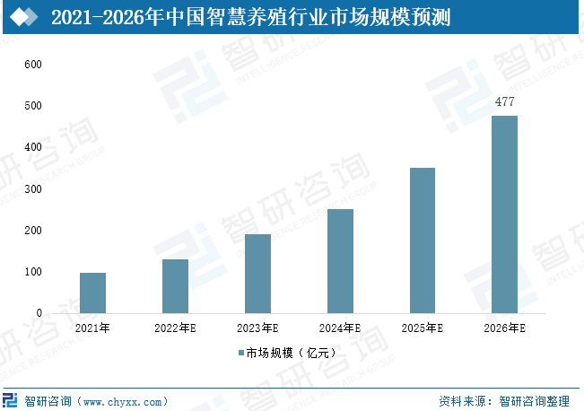 智慧養殖作為智慧農業組成之一,建設仍處于初期階段,2021年市場規模為98億元左右,未來在政策鼓勵及技術不斷創新下,中國智慧養殖建設不斷加速,將有越來越多的養殖企業將新興技術運用到養殖中,預計到2026年行業市場規模將達477億元。