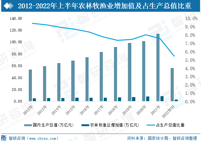 養殖業在我國發展歷史悠久,是我國農業主導產業之一。2021年中國農林牧漁業增加值為8.68萬億元,占生產總值的7.6%。2022年上半年農林牧漁業增加值為3.06萬億元,占生產總值的5.4%。
