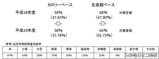 日本是世界上較大的農產品進口國家之一,但是俗話講:兵馬未動,糧草先行。農產品雖然目前在人們心中的地位有些下降,可是其“戰略物資”的地位并未動搖。日本同樣認識到這一點,上圖是日本農林水產省發布的資料,從上圖我們可以看出,在熱量(日本按照卡路里和生產額來劃分自給率)方面,日本的自給率達到了97%,蔬菜達到了75%,魚類是59%。