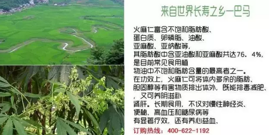 巴馬火麻產品介紹如下,“火麻仁含有豐富的蛋白質、不飽和脂肪酸,還有人體必需的微量元素。食之有潤腸胃、滋陰補虛、助消化、明目保肝、祛病益壽之功效,且對老人便秘、高血壓和高膽固醇等疾病有特殊的療效。當地人稱之為‘長壽麻’或‘長壽油’,長期食用火麻是巴馬百歲老人得以健康長壽的原因之一。