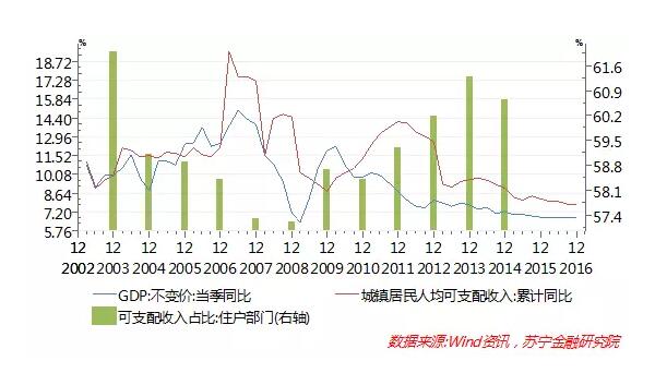 從實(shí)際變化趨勢(shì)看,自2010年以來(lái),城鎮(zhèn)居民人均可支配收入增速,始終顯著高于GDP增速,而住戶部門(mén)在國(guó)民收入分配中的比重,自2012年后連續(xù)三年保持在60%以上(參見(jiàn)下圖)。隨著降低社保繳費(fèi)等政策的繼續(xù)推行,預(yù)計(jì)這一趨勢(shì)還將得以延續(xù)。