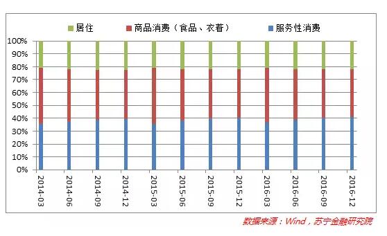 2014-2016年,城鎮(zhèn)居民用于醫(yī)療、教育、娛樂(lè)、旅游、交通等服務(wù)性消費(fèi)的支出占比由35.7%上升到41%,上升了5.3個(gè)百分點(diǎn),用于居住的支出占比也上升了1個(gè)百分點(diǎn),而用于商品消費(fèi)(食品和服裝)的支出占比由43.2%下降到36.8%,下降4.4個(gè)百分點(diǎn)(參見(jiàn)下圖)。