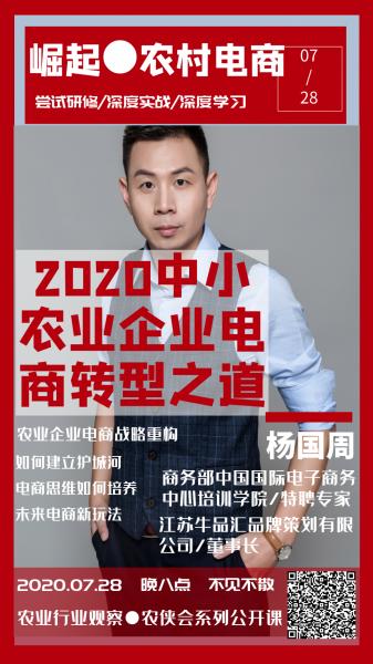 2020年7月28日和7月30日晚上20點,農(nóng)業(yè)行業(yè)觀察、農(nóng)俠會邀請了商務部中國國際電子商務中心培訓學院/特聘專家 楊國周老師做客分享,傳授電商轉(zhuǎn)型升級、電商裂變等新玩法、新思維。
