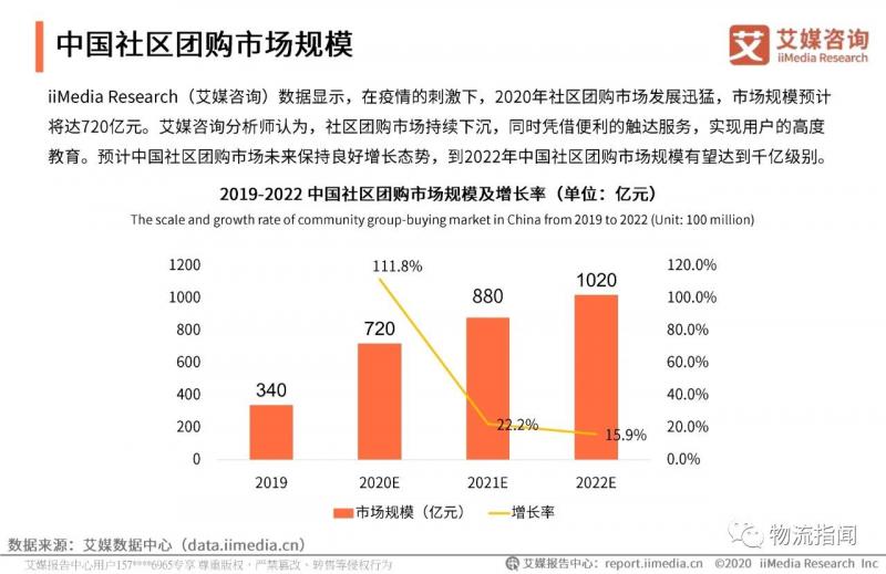 iiMedia Research(艾媒咨詢)數(shù)據(jù)顯示,在疫情的刺激下,2020年社區(qū)團購市場發(fā)展迅猛,市場規(guī)模預(yù)計將達720億元。艾媒咨詢分析師認為,社區(qū)團購市場持續(xù)下沉,同時憑借便利的觸達服務(wù),實現(xiàn)用戶的高度教育。預(yù)計中國社區(qū)團購市場未來保持良好增長態(tài)勢,到2022年中國社區(qū)團購市場規(guī)模有望達到千億級別。