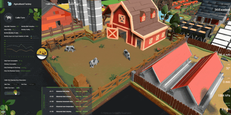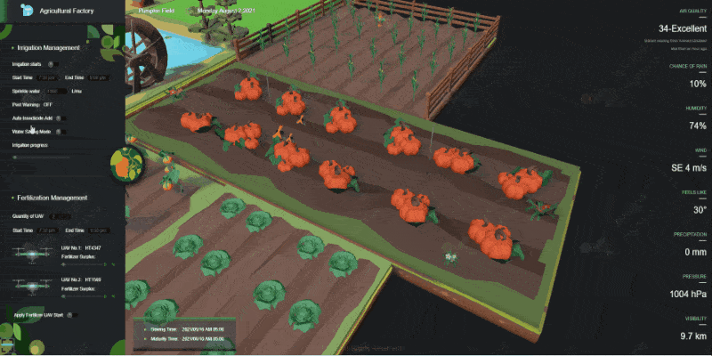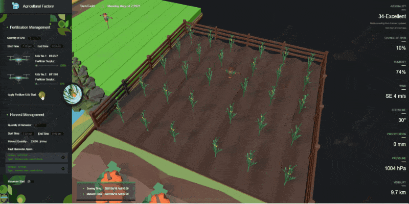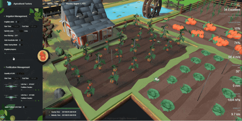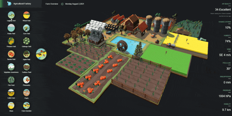 利用無人機對農田進行拍攝后,原始數據將通過5G網絡傳至云端進行實時數據分析和識別。分析結果可重新匹配到農田,然后,拖拉機或農用機器人會基于GPS導航駛向雜草生長的區域,實施精準清除。這一做法能減少高達90%的農藥使用量,后續還可能實現用熱水代替農藥來清除雜草。神經網絡和自學習算法使得植物識別越來越精確,但同時也會產生海量數據。運用 Hightopo 自主研發的 HT 產品,全程零代碼搭建 3D 輕量化 Low Poly 風格的智慧農場可視化解決方案,無縫融合 2D、3D 技術,1:1 還原農場的區域規劃,展開對農作物間的網格化管理。