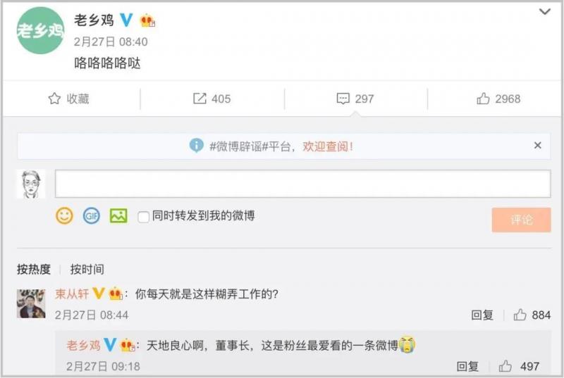 再說老鄉雞的官方微博,擁有40多萬粉絲,被網友戲稱為“史上最輕松的運營”,靠打鳴火了,每天一條“咯咯咯咯咯噠~”,還被董事長抓正著,評論“你每天就是這樣糊弄工作的?”