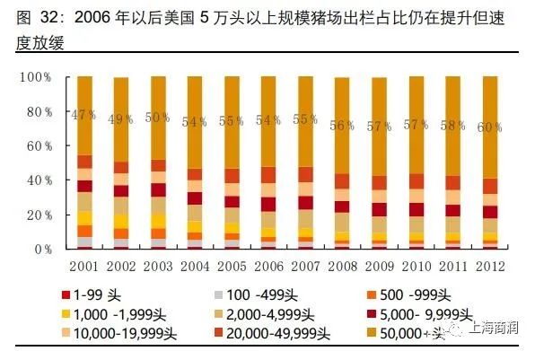 2)從美國生豬養殖行業規模化推進的過程中豬周期的長度看,規模化程度和豬周期的長度之間,也并沒有明顯規律。從豬場的戶均出欄規模和不同規模的豬場出欄量占比這兩個指標看,美國生豬養殖行業基本是在1980-2006年間完成的規模化,1980-2006年間美國豬場的戶均出欄規模從153頭增加至1602頭,此后美國豬場的戶均出欄規模雖然仍在提升,但速度已經顯著變慢;出欄結構方面,年出欄在50000頭以上的豬場出欄量占比在2005年達到55%左右,此后雖然50000頭以上豬場的出欄占比仍在提升,但幅度較小。在美國生豬養殖行業完成規模化的這26年間,共經歷了7輪豬周期,每輪豬周期的時長分別為5年、3年7個月、3年2個月、2年10個月、4年1個月、3年9個月和5年2個月,并沒有出現規模化提升后豬周期拉長的情況。