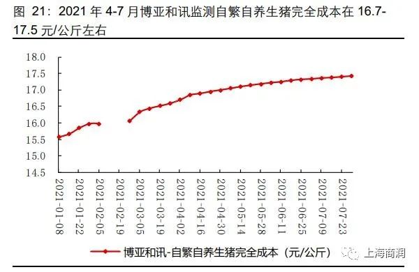 規模不經濟方面,當前行業自繁自養生豬平均完全成本在16-17元/公斤,而很多大規模豬企的完全成本在20元/公斤甚至更高。此外,根據涌益咨詢的8月對不同規模的自繁自養豬場的監測數據,能繁母豬存欄規模從50頭以下、50-200頭、200-500頭、500-2000頭遞增的過程中,生豬完全成本逐步上升,從50頭以下的15.48元/公斤上升至16.8元/公斤,母豬存欄量在500頭以上的豬場成本基本接近。