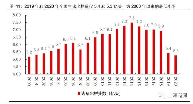 豬飼料產量的數據也一定程度上能反映不同周期生豬產能去化幅度,2019年全國豬飼料產量為7663萬噸,同比減少26.6%,在前三輪豬周期中,2006年和2007年豬飼料產量同比僅減少5.5%和0.35%,2015年豬飼料產量同比僅減少3.2%。受能繁母豬產能大幅去化影響,2019年和2020年全國生豬出欄量僅5.4和5.3億頭,為2003年以來的最低水平,較豬價上漲周期啟動前的2018年減少21.6%和24.0%,而在前三輪豬周期中,出欄量最低的年份,即2007年、2011年和2016年,全國生豬出欄量較豬價上漲前的出欄高峰僅減少7.5%、0.4%和6.5%。