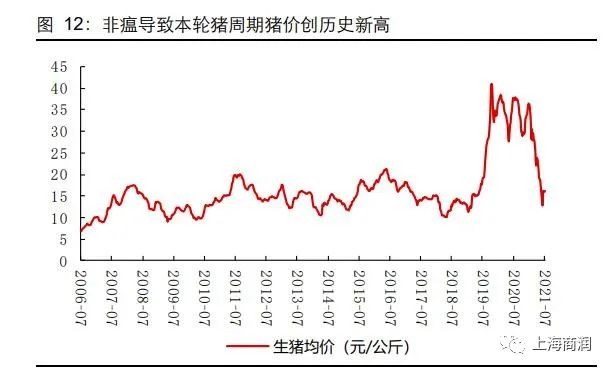 2)2019年2月以來的周期中,受非洲豬瘟影響,能繁母豬產能去化幅度創歷史新高,2019年10月全國能繁母豬存欄量同比最大降幅達到38.90%,生豬出欄量降幅同樣創歷史新高,2020年全國生豬出欄量較2018年減少24.04%,產能大幅去化使得豬價也達到創歷史的高度,2019年豬價最高達到40.98元/公斤,最大漲幅為262%;