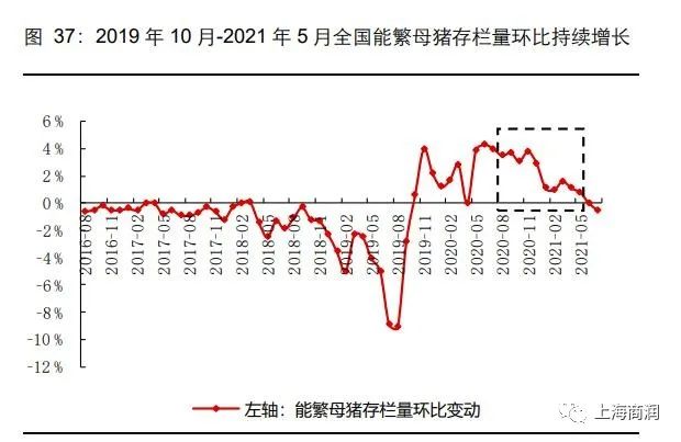 1)農業農村部的監測數據顯示,全國能繁母豬存欄量環比降幅自2018年4月起擴大,2018年12月-2019年9月是母豬產能去化速度最快的階段,2019年9月能繁母豬存欄量同比降幅達到最大,2019年10月能繁母豬存欄量首次環比轉正,且自此持續恢復;