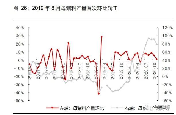 3)中國飼料工業協會統計的母豬料產量數據顯示,2018年11月-2019年7月母豬料產量環比為負(由于季節性備貨原因,其中2019年3月環比為正),2019年8月母豬料產量首次環比轉正;