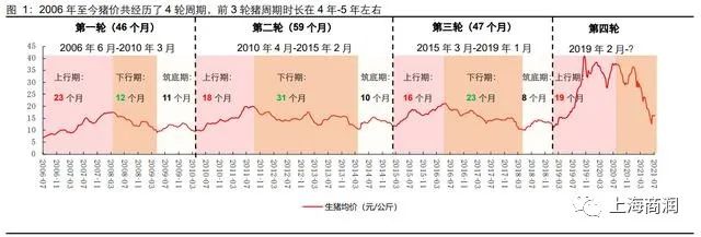 回顧2006年以來的豬價表現,以豬價開始持續上行為起點,可以將其劃分為4輪周期,一輪完整的豬周期時長在4年-5年左右,其中時長差異最大的是下行期。4輪豬周期分別為2006年6月-2010年3月、2010年4月-2015年2月、2015年3月-2019年1月以及2019年2月至今,每輪豬周期可以分為豬價上行期、下行期和筑底期三個階段。在前三輪豬周期中,一輪完整的豬周期在4年-5年左右,其中上行期的時長在1.5年-2年左右,下行期時長差異較大,時長在1年-2.5年左右,在豬價一次探底后,還會在低位持續一段時間,我們稱之為筑底期,一般在8個月-12個月左右,隨后二次探底,并開啟下一輪豬周期。
