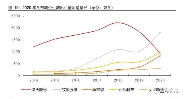 2)2017年-2019年一季度,豬價在2018年3月首次跌破成本線,2018年3月-2018年7月,行業持續虧損,且頭均虧損幅度較大,在此背景下,2018年4月起,全國能繁母豬存欄量開始持續較大幅度下滑,2018年10月起,受非瘟豬瘟影響,母豬產能去化速度進一步加快。與此同時,以牧原、溫氏、正邦、新希望和天邦為代表的5家頭部上市豬企,其合計生產性生物資產于2018Q4-2019Q1連續兩個季度環比下滑,比全國能繁母豬存欄量開始去化的時間晚6個月,且這期間頭部豬企母豬產能去化主要是由非洲豬瘟導致的、而非主動去產能。