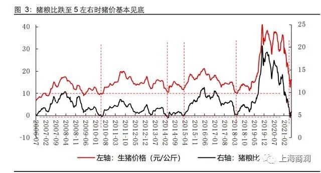 而豬價底部受到養殖成本的影響,在2006年以來的4輪豬周期中,可以將豬糧比跌至5左右做為豬價見底的標志。每輪周期的底部,豬價都會跌至成本線以下,從過往歷史看,豬價下跌是有底的,我們將豬糧比作為養殖盈利/虧損的指標,可以看到,當豬糧比跌至5左右時,豬價即見底。在一個完整的豬周期中,豬糧比有可能二次探底,即在豬價磨底時和豬價啟動反轉時,豬價有可能兩次處于低位,豬糧比兩次跌至5左右。