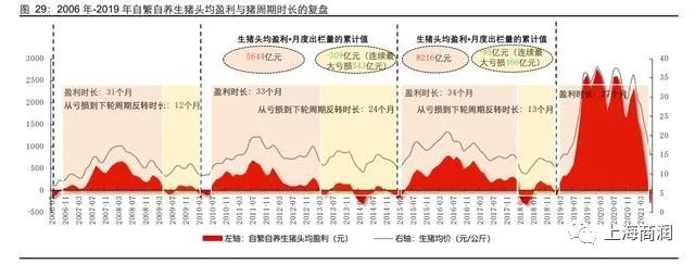 從2006年以來的豬周期復盤來看,并不能得出養殖盈利越高、豬周期下行時間越長的結論。2006年6月-2010年3月、2010年4月-2015年2月和2015年3月-2019年2月這三輪豬周期中,持續盈利時長分別為31個月、33個月和34個月,從自繁自養生豬首次虧損到下輪周期反轉時長分別為12個月、24個月和13個月,可以看到,持續盈利時長和開始虧損后磨底時長之間并沒有明顯規律。