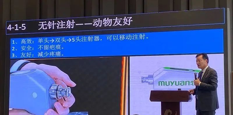 我們做的無注射針頭,就是我們這個注射器是沒有帶針的。通過高壓,輕輕地跟豬一碰,就打一針。現在我們又覺得這個不夠,我們開發出了這個從單針頭到雙針頭。現在我們又開發有五個注射器的——這些全部是我們自己的知識產權。那好處就是不把豬的深層的肌肉劃傷。