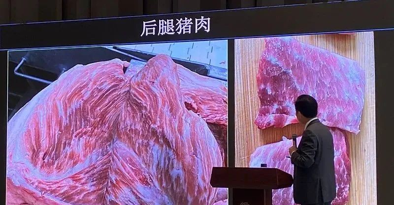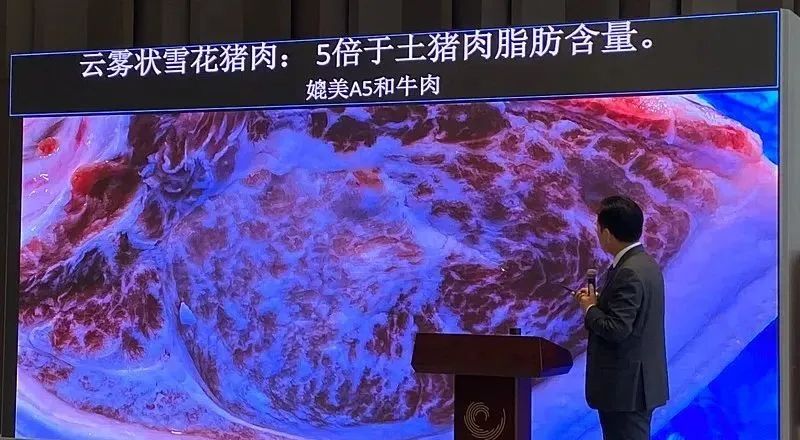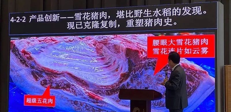 更關鍵的是我們培育了雪花豬肉。這個發現堪比野生水稻的發現。我們這個現在已經克隆復制了。那么這些豬肉就說是像這些地方大家能看到是五花肉,這里脊本身是紅紅的,結果是不是像雪花一樣,非常像大理石紋。那么這些是我們過去想都不敢想的。那么這些豬肉的脂肪含量香得很。這是個后腿肉。我們原來豬的后腿肉都很紅,現在后腿肉都像石頭一樣有大理石紋——白的都是吃的香的嫩的那個脂肪。