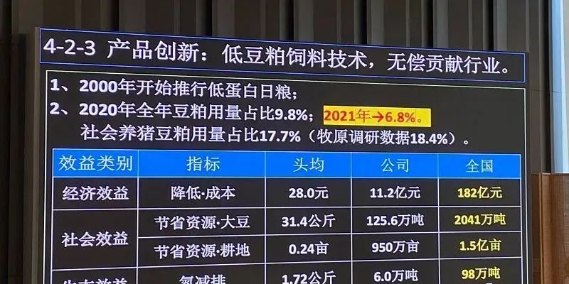 去年年底我有給領導們又督促,我說領導要大力推廣。我們 2021 年 12 月 25 號我們結賬,我的豆粕用量降到了6.8%,和我們專家們的推廣的標準相差一倍。我說這個沒問題,我們基本上都這樣做。也就是說這個產品創新不僅僅是一個成本問題,關系到社會、經濟、政治甚至穩定的問題,價值非常大。