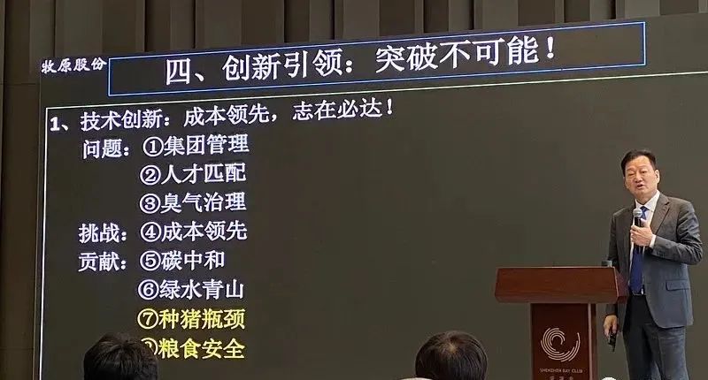 當然我們在其他方面(聽不清),我們的種豬,突破種豬瓶頸。牧原的育種,二元輪交一下子讓全中國不缺豬了,特別是非洲豬瘟的時候不缺種豬。國家領導和我們那個行業部門都很高興,因為有牧原向社會提供大量的種豬,給予牧原很高的評價和肯定。還有糧食安全。