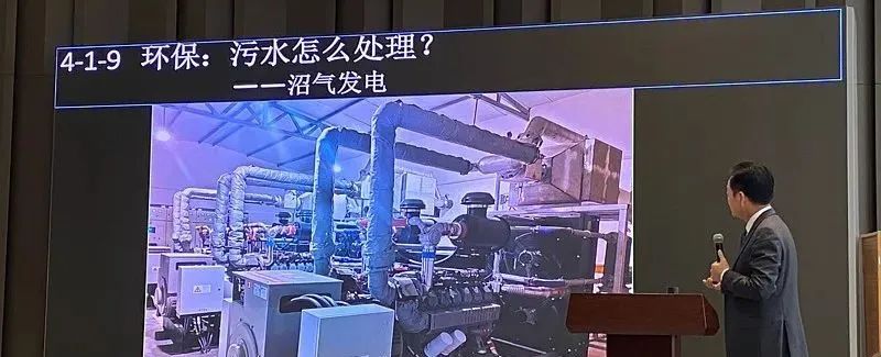 然后我們的污水怎么處理啊?沼氣發電,這是我們的發電機。現在綠色能源會和其他地方合作,原來不掙錢,現在沼氣發電開始盈利了。