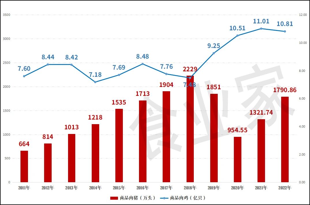 作為中國的雞豬養殖大戶。溫氏股份2022年銷售肉豬1790.86萬頭,銷售肉雞10.81億只。數據顯示,2022年全國白羽肉雞、黃羽肉雞累計出欄98.2億只,溫氏股份肉雞出欄量約占行業的11%。