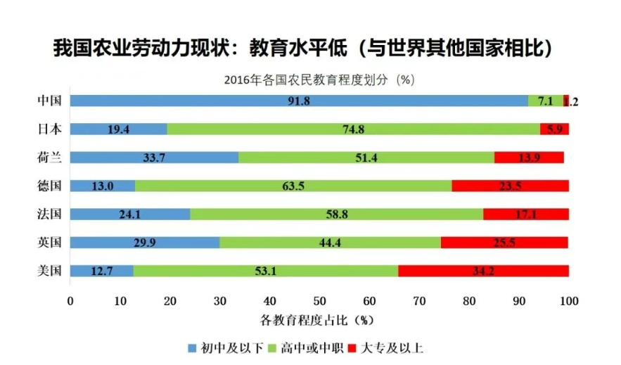 勞動力素質短板:我國農業勞動力教育水平顯著低于發達國家,并且,與其他行業相比,我國農、林、牧、漁業從業人員教育水平低,高中及以上教育程度就業人員占比僅7.9%,制約技術應用與產業升級。