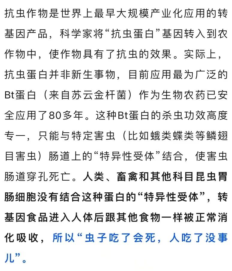 對害蟲起作用的抗蟲蛋白,進入人的消化道后不會對人發揮作用??瓜x蛋白對我們來說就跟牛奶中的蛋白質、豬肉中的蛋白質、植物中的蛋白質一樣被人體消化降解,不會對我們造成傷害,所以人吃了轉基因抗蟲作物不會有事。